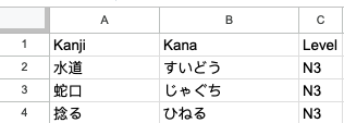 The initial population of the database is done through a Google Sheet spreadsheet that I made & fill. It consists of 4 columns: Kanji, Kana (acts as a fallback & safeguard since Japanese do be like that sometimes), Level (N5-N1), Tag (not shown in the image).