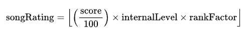 In short, you multiply your score (maimai’s score range is 0-101), divide it by 100, multiply by the internal level, and multiply by the rank factor. The rank factor is a factor that is decided by your score. It looks like this: