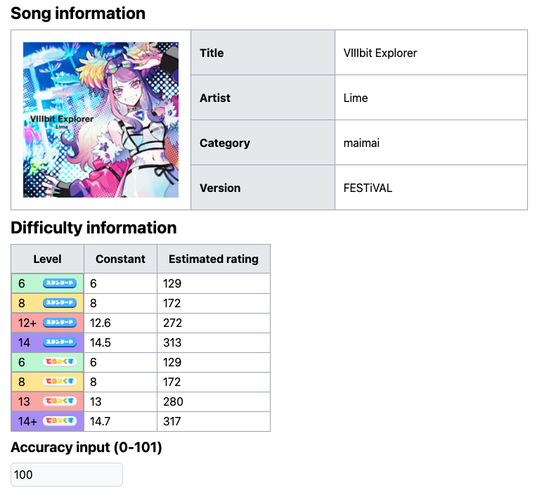 Other than that, it would be great if I can somehow get the current user’s rating. I still don’t know how people do it, but there are some online tools to get your rating breakdown, such as maichart and mai-tools.